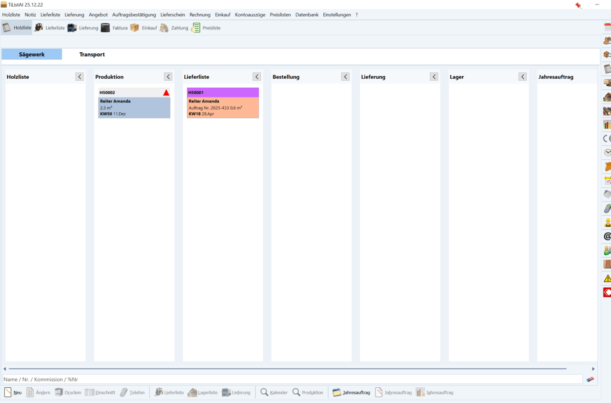 Das Kanban-Board dient der zentralen Steuerung und Überwachung aller laufenden Vorgänge im Bereich Sägewerk und Transport.